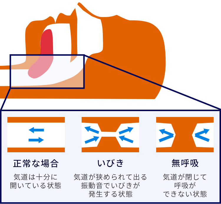 いびきは、気道が狭まって空気の流れが悪くなり、振動が起こることで音となります。